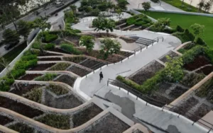 Penerapan konsep green infrastructure, seperti taman hujan (rain garden), atap hijau (green roof), dan dinding hijau (green wall), dapat membantu mengelola air hujan secara alami di kawasan padat bangunan.
